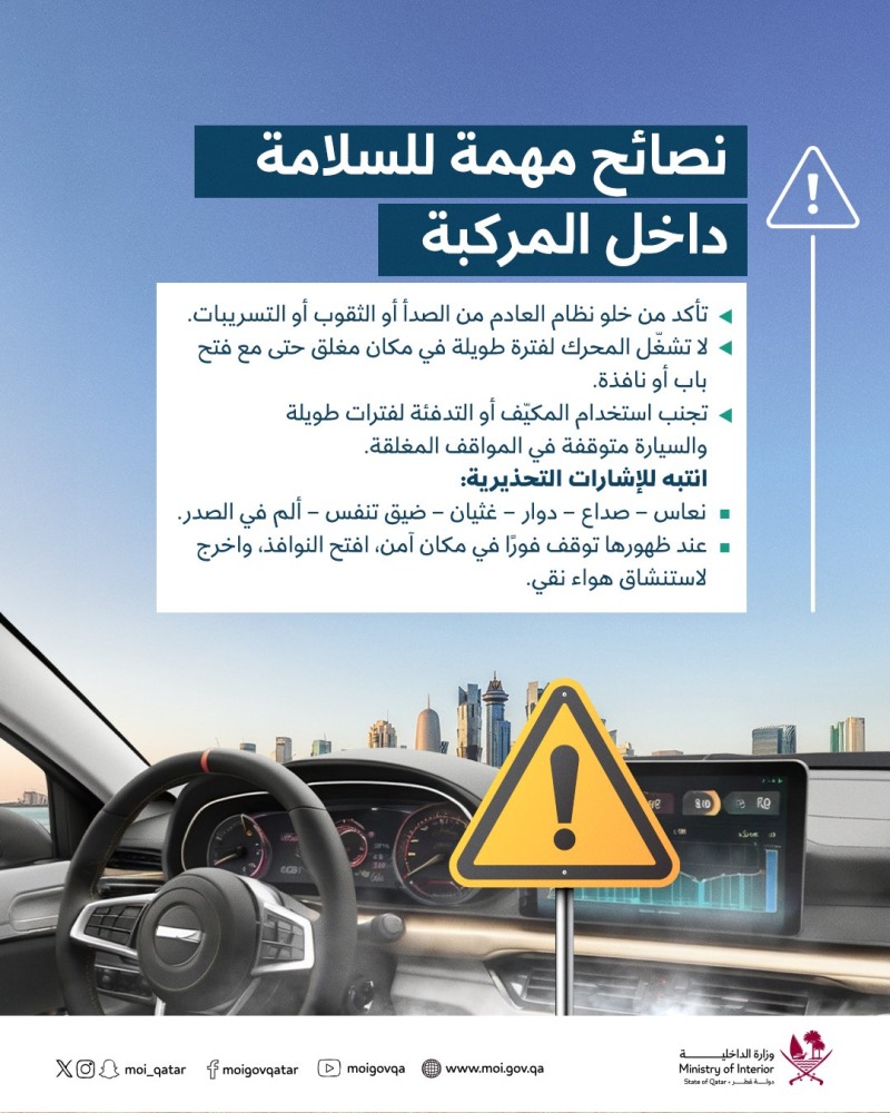 * نصائح وإرشادات للوقاية من حوادث الاختناق داخل المركبات بسبب "الغاز الخفي":