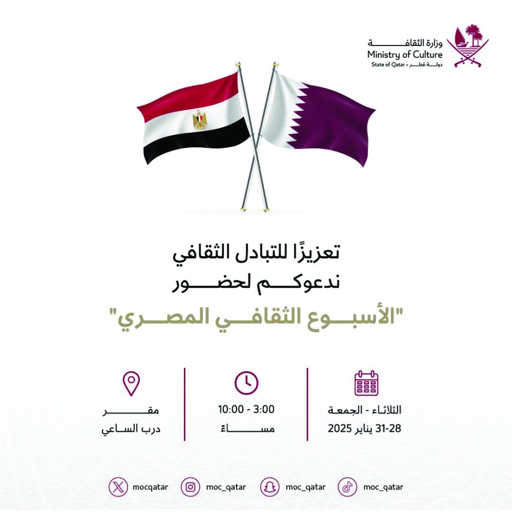 أعلنت وزارة الثقافة عن تنظيم الأسبوع الثقافي المصري، في مقر درب الساعي الدائم بأم صلال، وذلك خلال الفترة من 28 إلى 31 يناير الجاري، وبالتعاون مع وزارة الثقافة المصرية، وبمشاركة وفد رسمي رفيع المستوى، إضافة إلى نخبة من الحرفيين والمتخصصين في مجالات الفنون والتراث.