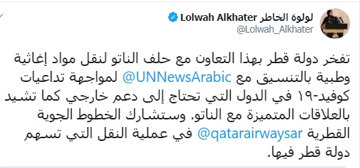 من جانبها، علقت سعادة السيدة لولوة الخاطر مساعد وزير الخارجية على مبادرة التعاون، قائلة : تفخر دولة قطر بهذا التعاون مع حلف الناتو لنقل مواد إغاثية وطبية بالتنسيق مع الأمم المتحدة لمواجهة تداعيات كوفيد-١٩ في الدول التي تحتاج إلى دعم خارجي كما تشيد بالعلاقات المتميزة مع الناتو.