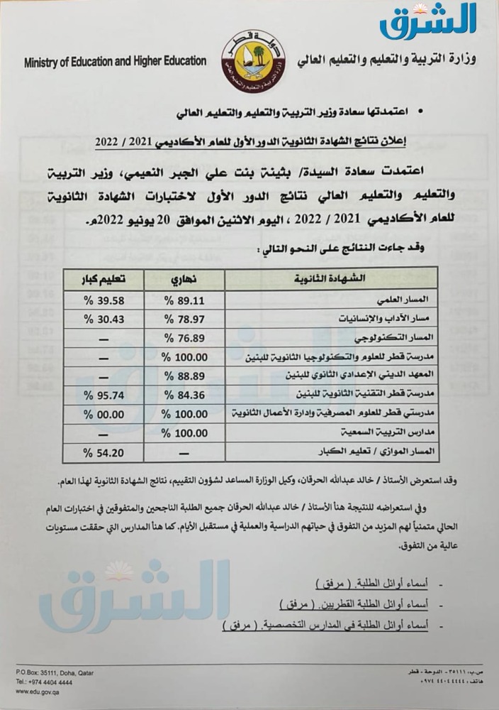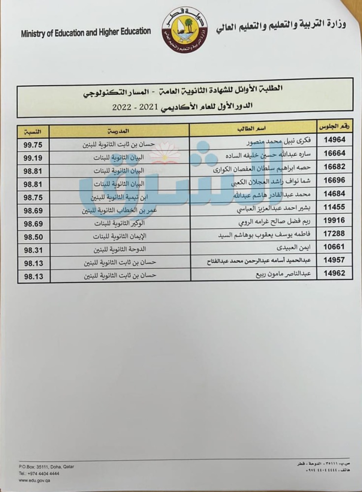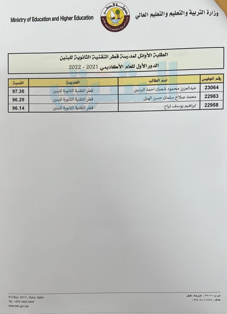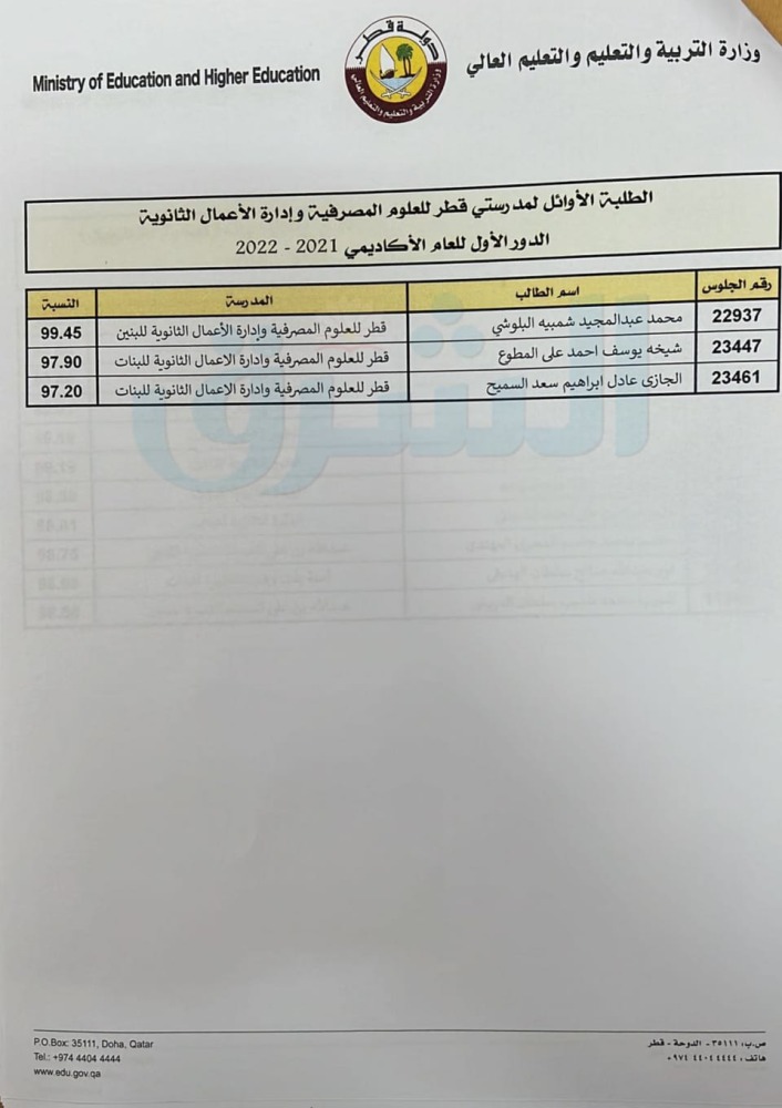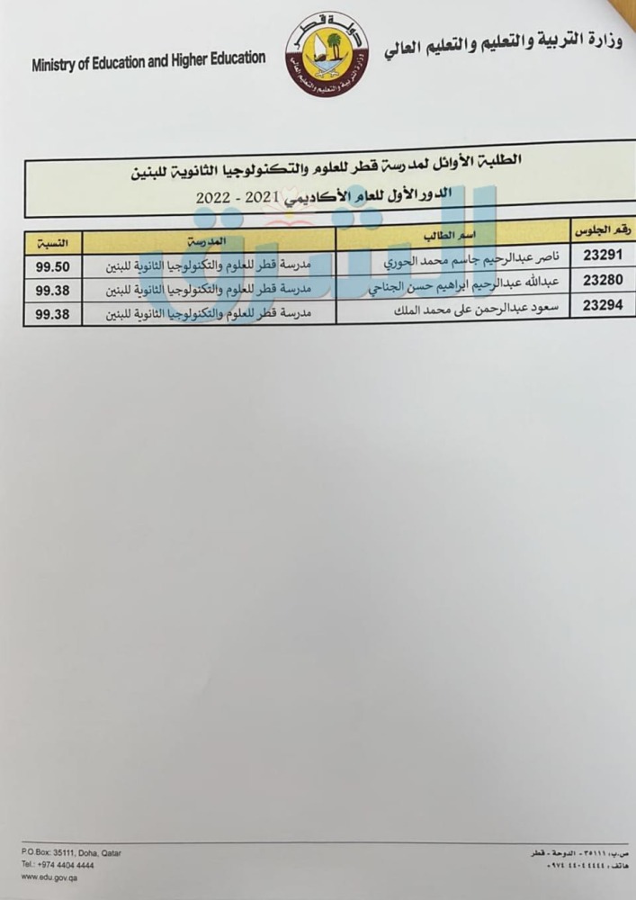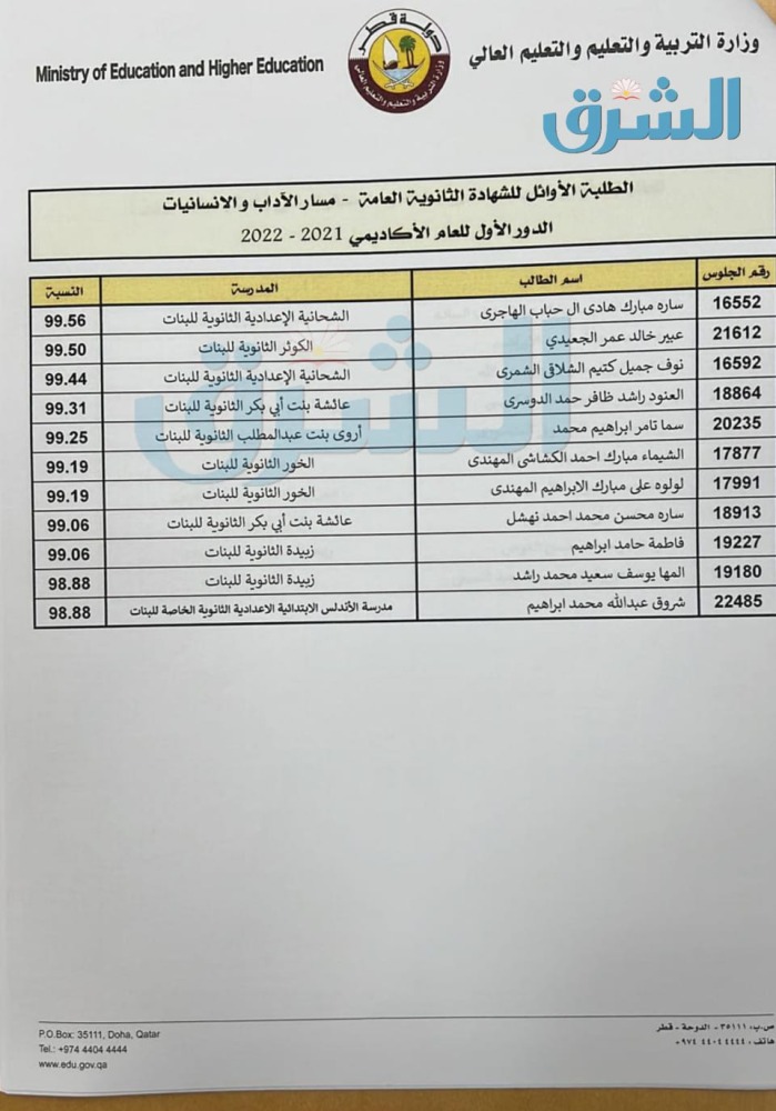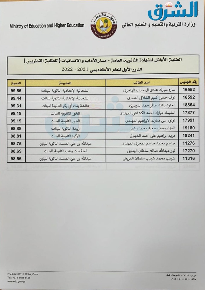 أسماء أوائل الثانوية العامة للطلبة القطريين مسار الآداب والإنسانيات
