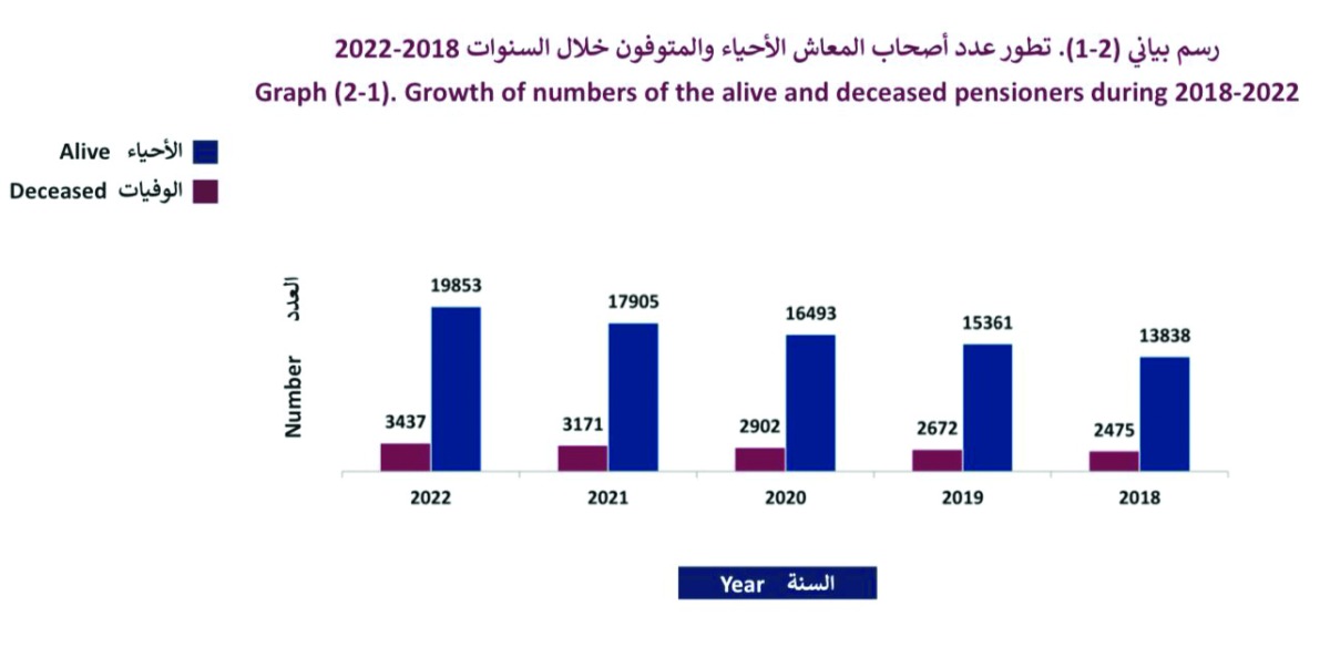 كما أشار التقرير إلى أن إجمالي الاشتراكات 15 % في تزايد مستمر خلال السنوات من 2018 وحتى 2022، وذلك نتيجة تزايد عدد المشتركين خلال السنوات السابقة لعام 2022، وهو الوضع الطبيعي والآمن للمحافظة على استمرارية الصندوق، وقد بلغت نسبة الزيادة لإجمالي الرواتب 5.2 %، وبلغ متوسط الراتب الشهري 27.019 ريال قطري في عام 2022. في حين أشارت البيانات الواردة في التقرير إلى تطور أعداد أصحاب المعاش الأحياء والمتوفين خلال السنوات 2018- 2022، حيث بلغ عدد أصحاب المعاشات 23290 في عام 2022، وبزيادة تبلغ 2214 صاحب معاش، وبنسبة 10.5 % عن العام الماضي، وتبلغ نسبة الأحياء 85.2 % بينما تبلغ نسبة الوفيات 14.8 %.