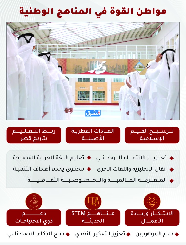 المناهج الوطنية القطرية تتمتع بعدد من عناصر القوة التي تجعلها مختلفة ومميزة. فهي بالدرجة الأولى تركّز على ترسيخ القيم الإسلامية والعادات والتقاليد القطرية الأصيلة، وربط المحتوى التعليمي بتاريخ قطر وإنجازاتها، مما يعزز الانتماء الوطني ويزرع في نفوس الطلبة شعورًا بالفخر والهوية.
