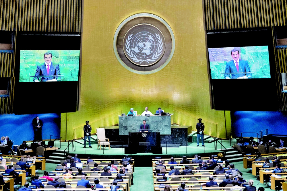 تكتسب مشاركة دولة قطر في اجتماعات الجمعية العامة للأمم المتحدة التي تنعقد سنويا في نيويورك أهمية كبيرة ويحرص حضرة صاحب السمو أمير البلاد المفدى على مخاطبتها سنويا منذ شهر سبتمبر 2013، انطلاقاً من إيمان سموه بأهمية هذه المنظمة العالمية ورسالتها السامية، والمسؤولية الملقاة على عاتقها في حفظ السلام والاستقرار بالعالم ونزع فتيل الأزمات الدولية. تتميز خطابات سمو الأمير في كل دورة من الأمم المتحدة بشموليتها ومواكبتها للمستجدات والقضايا الآنية والاستراتيجية في نفس الوقت، ممتلئة بالجانب القيمي التنموي والحضاري.