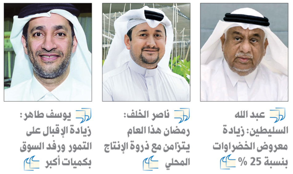بدوره قال السيد ناصر أحمد الخلف المدير التنفيذي لشركة اجريكو للتطوير الزراعي، إن شهر رمضان هذا العام يتزامن مع ذروة الإنتاج المحلي، خاصة وأن موسم حصاد المنتجات القطرية يبدأ في شهر سبتمبر، مشيرا إلى أنه كما هو معروف انه خلال شهر رمضان المباركة تزداد وترتفع نسبة الاستهلاك وكذلك تزداد القوة الشرائية على الخضراوات وغيرها. وأشار إلى استعدادهم لضخ كميات تتناسب مع زيادة حركة البيع والشراء بنسبة تتراوح ما بين 20 إلى 30 % من مختلف انواع الخضراوات ومنها الطماطم والخيار والفلفل والباذنجان، إلى جانب توفير كميات مناسبة من الأسماك واللحوم المصنعة التي ينتجها مصنعهم. وأوضح السيد الخلف أنهم يقومون بالزراعة في البيوت المحمية، إلى جانب توجههم إلى الزراعة الداخلية وتوفير ما يحتاجه النبات من حرارة وإضاءة وكذلك المياه، مشيرا إلى أنهم ايضا يتجهون إلى الزراعة العمودية وهي إحدى التقنيات الزراعية الحديثة، مما يجعلهم مستمرين في الإنتاج وتلبية احتياجات السوق وتوفير كافة الخضراوات المحلية والتي تتميز بجودة عالية. وأضاف قائلا: ولله الحمد، إننا في ذروة الإنتاج المحلي أي أن إنتاجنا سيكون متزايدا وموجود اومستمرا حتى نهاية شهر ابريل.