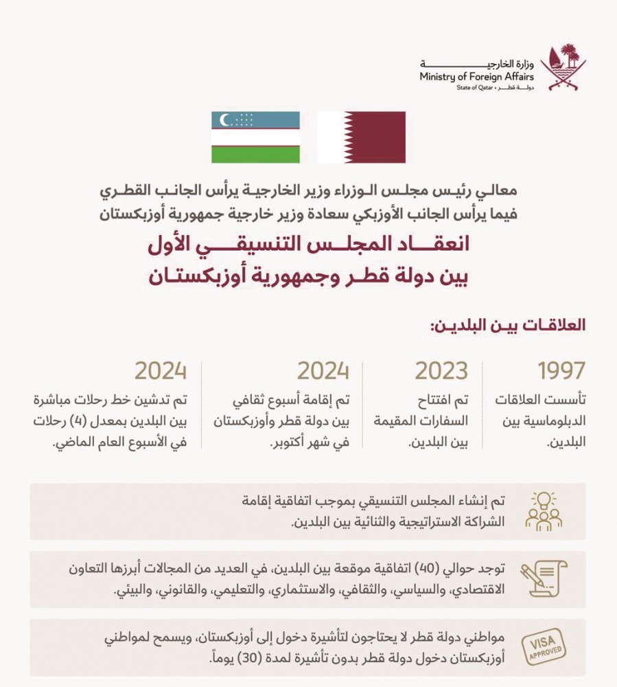 وقال سعادة السيد أشرف خوجاييف سفير جمهورية أوزبكستان لدى الدولة في تصريحات سابقة لـ «الشرق» إن العلاقات بين قطر وأوزبكستان تشهد فصلا جديدا من الشراكة، مشيرا إلى أن العلاقات بين أوزبكستان وقطر ازدهرت في السنوات الأخيرة، حيث تعززت هذه العلاقات بفضل الزيارات رفيعة المستوى، بما في ذلك زيارة حضرة صاحب السمو الشيخ تميم بن حمد آل ثاني أمير البلاد المفدى، إلى أوزبكستان في يونيو 2023، وزيارة فخامة رئيس أوزبكستان شوكت ميرضيائيف إلى قطر في أكتوبر 2023.