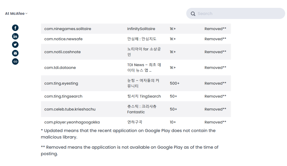وأكد فريق مكافي أنه اكتشف أكثر من 60 تطبيقاً تحتوي على هذه المجموعة الخبيثة التابعة لجهات خارجية، مع أكثر من 100 مليون عملية تنزيل. وأبلغ الفريق "غوغل" بالفعل بالمشكلة والتي بدورها طلبت من المطورين إصلاح تطبيقاتهم أو حظرها من متجر التطبيقات الخاص بها.