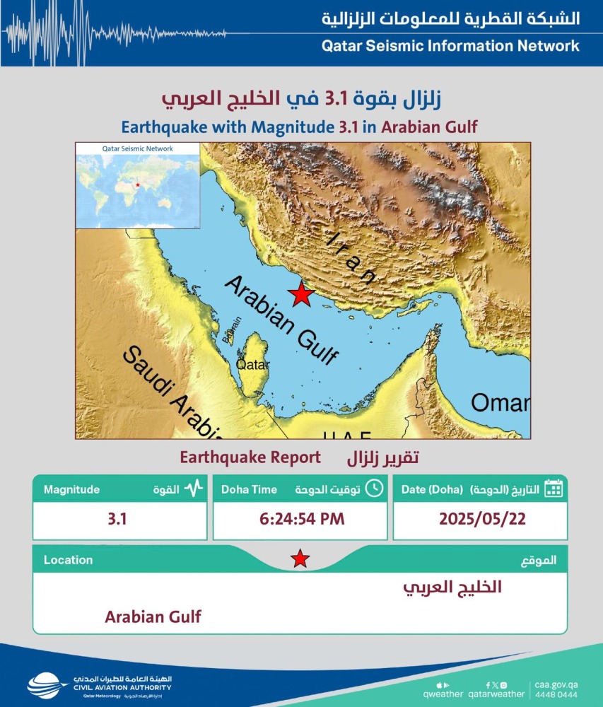 أعلنت الشبكة القطرية للمعلومات الزلزالية عن وقوع زلزال بقوة 3.1 في الخليج العربي في تمام الساعة 6:24:54 مساء اليوم الخميس بتوقيت الدوحة.
