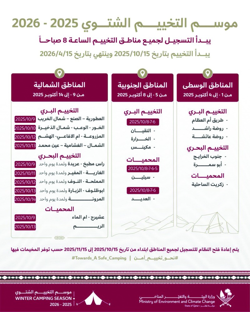 وأوضحت الوزارة أن عملية التسجيل ستتم على ثلاث مراحل زمنية وفق التوزيع الجغرافي، تبدأ بالمنطقة الوسطى من 1 إلى 4 أكتوبر، تليها المنطقة الجنوبية من 5 إلى 8 أكتوبر، ثم المنطقة الشمالية من 9 إلى 14 أكتوبر، مشيرة إلى أن المواقع المخصصة للتخييم تشمل مناطق برية وبحرية ومحميات طبيعية موزعة في مختلف أنحاء الدولة.