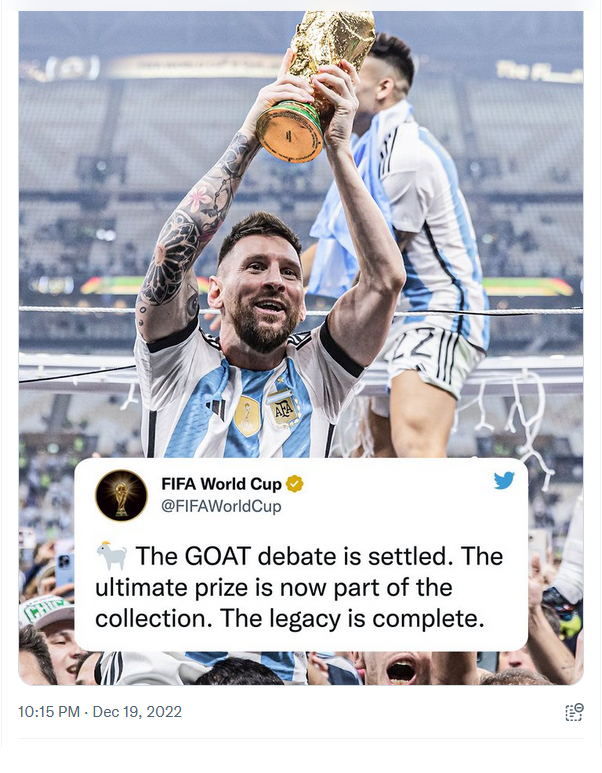 وجاء في التغريدة المحذوفة، بحسب موقع "الحرة": "حسم الجدل حول من هو أفضل لاعب في العالم.. كأس العالم أصبحت جزءاً من المجموعة.. الإرث اكتمل" إلى جانب صورة لميسي مع كأس العالم.