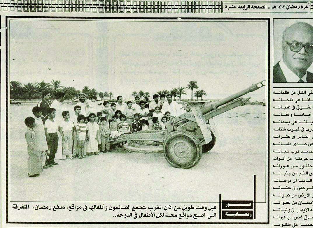 في غرة رمضان 1413، وقبل موعد أذان المغرب والتجمع حول مائدة الإفطار، تجمع الصائمون وأطفالهم في مواقع مدفع رمضان ليشاهدوا لحظة إطلاقه والاحتفاء بالأجواء الرمضانية والاستمتاع بأبرز العادات الرمضانية التي تميز الشهر الكريم.