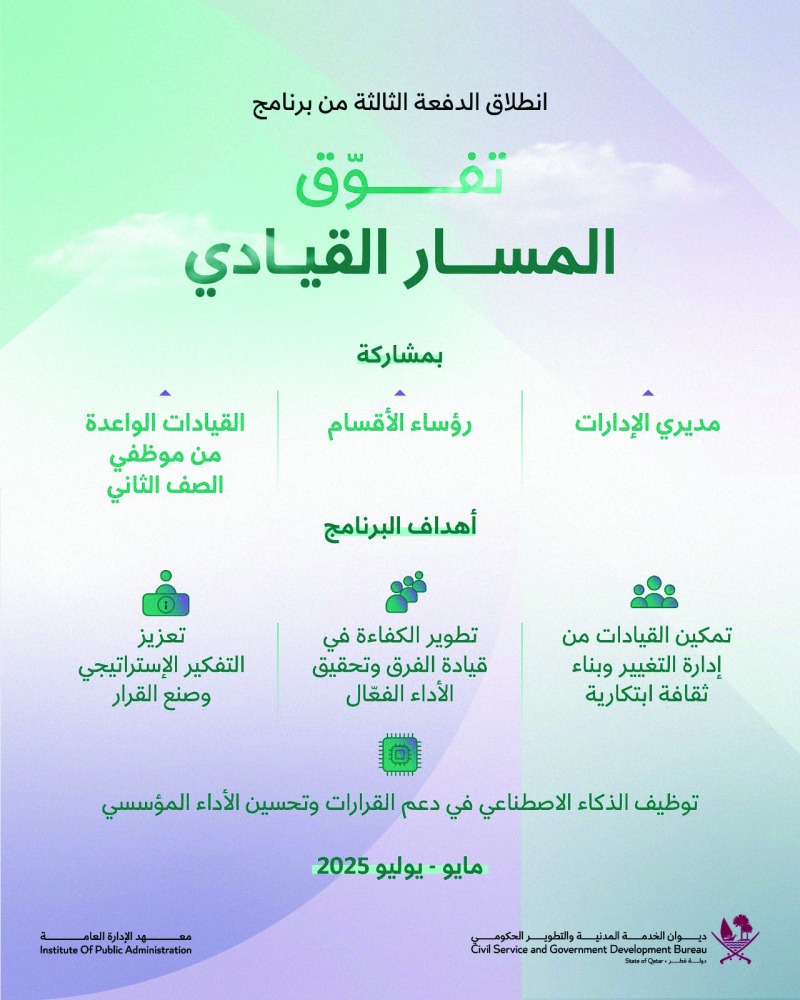 في إطار مواصلة ديوان الخدمة المدنية والتطوير الحكومي جهوده في تعزيز الجاهزية القيادية والتطوير المهني في القطاع الحكومي، انطلقت الدفعة الثالثة من برنامج «تفوق المسار القيادي»، الذي ينفذه الديوان ممثلًا بمعهد الإدارة العامة، ويستمر خلال الفترة من مايو وحتى يوليو الجاري.