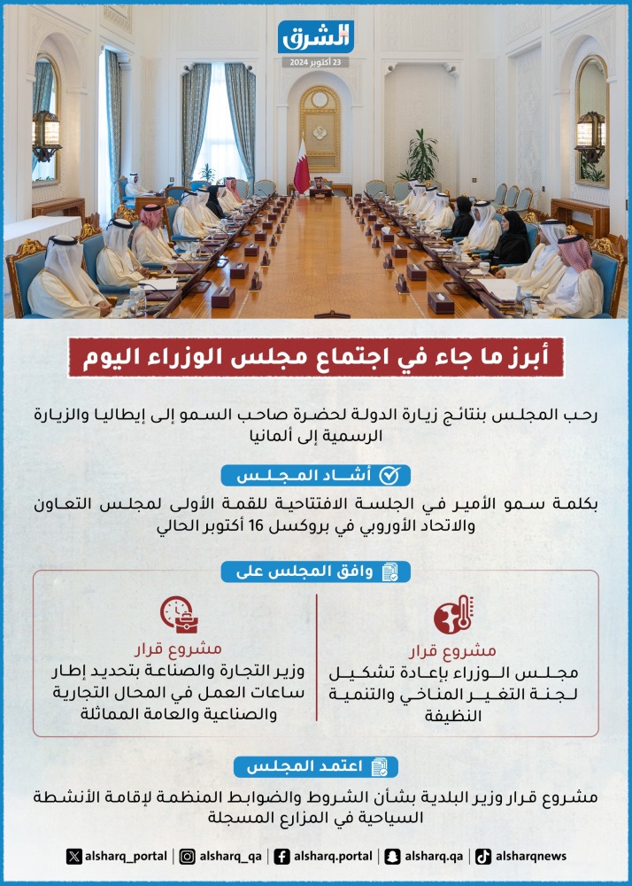 في بداية الاجتماع رحب مجلس الوزراء بنتائج زيارة الدولة التي قام بها حضرة صاحب السمو الشيخ تميم بن حمد آل ثاني أمير البلاد المفدى "حفظه الله" إلى الجمهورية الإيطالية، خلال الفترة من العشرين إلى الثاني والعشرين من شهر أكتوبر الحالي، والزيارة الرسمية التي أعقبتها يوم أمس الثلاثاء إلى جمهورية ألمانيا الاتحادية.