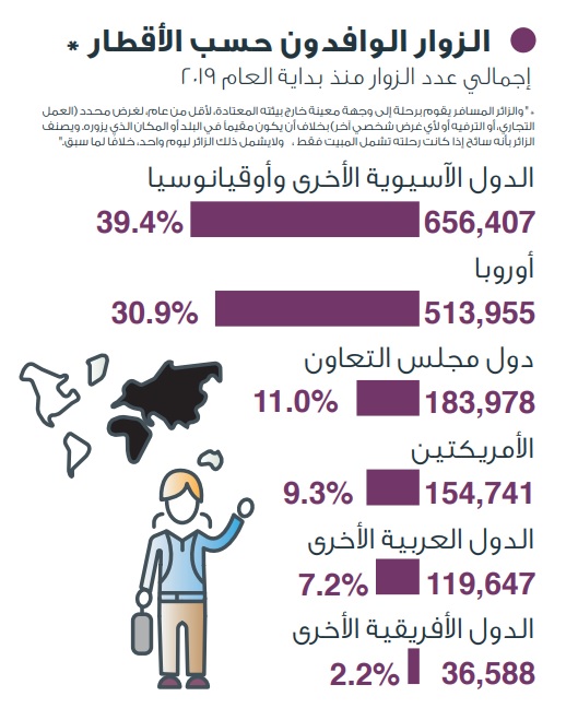 ووفق تقرير الجهاز فقد سجل الزوار من الدول الآسيوية العدد الأكبر بـ 656.407 آلاف وبنسبة 39.4%، ومن الدول الأوروبية 513.955 ألفاً وبنسبة 30.9%، ومن دول مجلس التعاون الخليجي 183.978 ألفاً وبنسبة 11%، و154.746 ألفاً وبنسبة 9.3% من الأمريكتين، و119.647 ألفاً من الدول العربية بنسبة 7.2%، و36.588 ألفاً من الدول الأوروبية بنسبة 2.2%.
