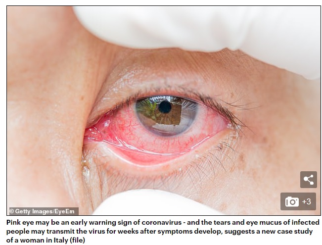 ووفقاً لصحيفة "ديلي ميل" البريطانية، فإن "العلماء في المعهد الوطني للأمراض المعدية في إيطاليا، وجدوا أن الفيروس استمرّ في عين المرأة لمدة 21 يوماً بعد ظهور الأعراض لأول مرة".