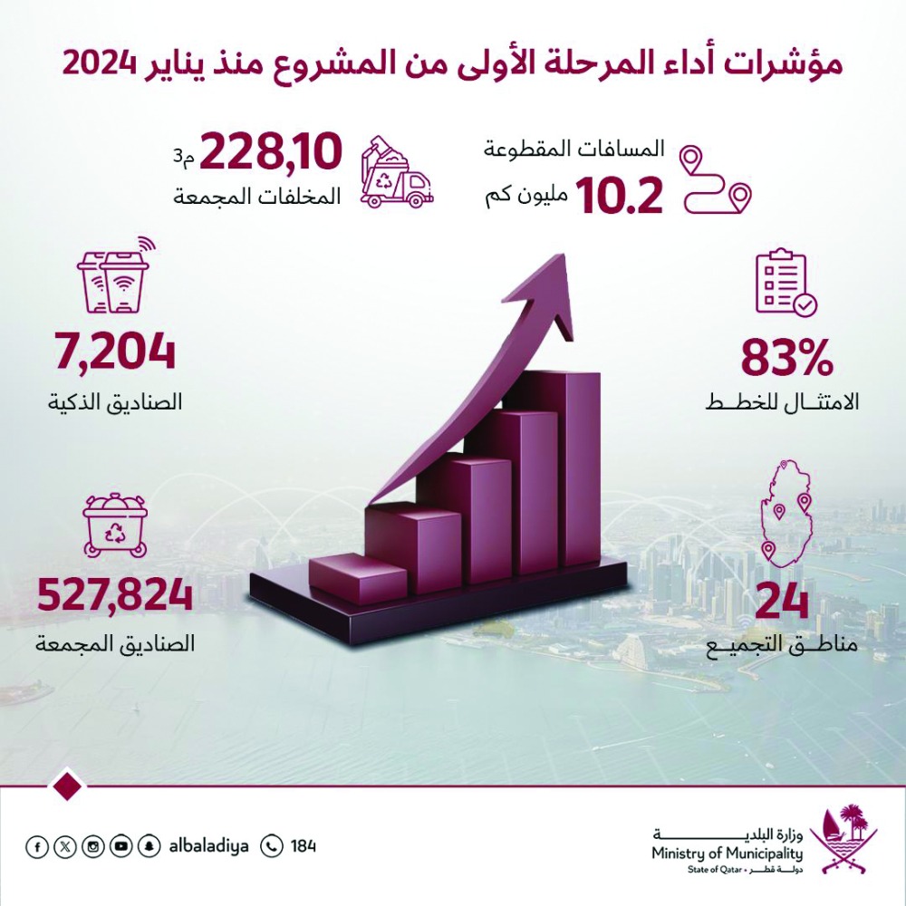 وأضاف أن مشروع الإدارة الذكية للنفايات يعتبر من أكبر مشاريع المدن الذكية والتحول الرقمي في وزارة البلدية، وهو يعتبر محاكاة ذكية لتنفيذ العمليات التقليدية المتبعة في إدارة وجمع النفايات، وقد تم تطبيق المشروع في مرحلته الأولى على جميع حاويات النفايات والمركبات التابعة لمدينة الوكرة، حيث يقوم النظام حاليا بإدارة جميع خطط جمع النفايات بشكل تلقائي تام وبدون أي تدخل بشري، حيث بدأ رصد حدوث انخفاض ملحوظ في عدد رحلات الجمع ومركبات ضغط النفايات، ونسعى خلال الفترة القادمة إلى الوصول إلى أقل عدد ممكن للرحلات والمركبات لتحقيق أهم أهداف هذا المشروع.
