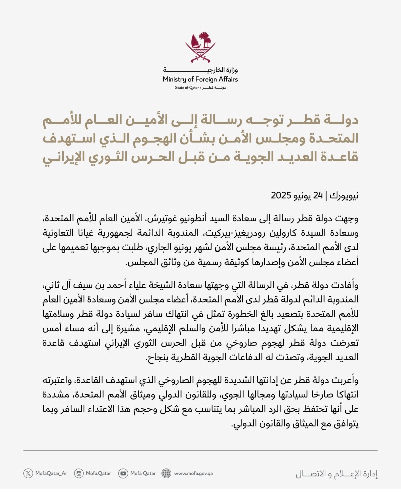 وأفادت دولة قطر، في الرسالة التي وجهتها سعادة الشيخة علياء أحمد بن سيف آل ثاني، المندوبة الدائم لدولة قطر لدى الأمم المتحدة، أعضاء مجلس الأمن وسعادة الأمين العام للأمم المتحدة بتصعيد بالغ الخطورة تمثل في انتهاك سافر لسيادة دولة قطر وسلامتها الإقليمية مما يشكل تهديدا مباشرا للأمن والسلم الإقليمي، مشيرة إلى أنه مساء أمس تعرضت دولة قطر لهجوم صاروخي من قبل الحرس الثوري الإيراني استهدف قاعدة العديد الجوية، وتصدّت له الدفاعات الجوية القطرية بنجاح.