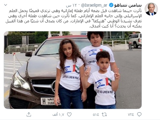 وعلق نتنياهو على استغلال الإمارات لأطفالها في الهرولة نحو التطبيع بارتداء أطفال إماراتيين العلم الإسرائيلي وعزفهم نشيد الاحتلال، بالقول : من كان يصدق أن شئيًا من هذا القبيل يمكنه أن يحدث؟ أنا كنت أصدق.