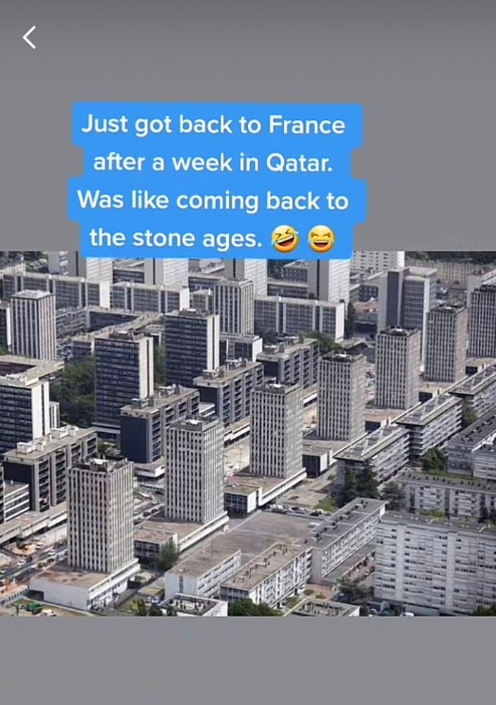 كما قال أحد المجشعين مرفقاً صورة لمباني باريس بأن العودة إلى باريس بعد زيارة قطر تشبه العودة إلى "العصور الحجرية".