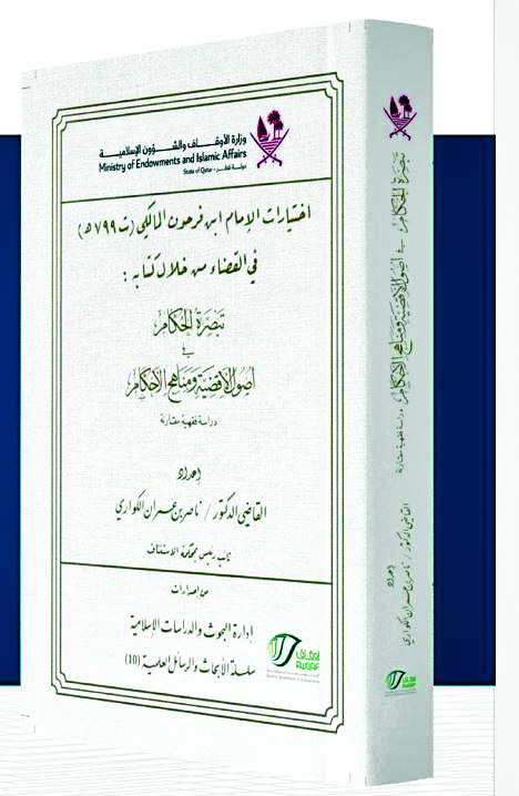 أصدرت إدارة البحوث والدراسات الإسلامية بوزارة الأوقاف والشؤون الإسلامية الكتاب العاشر في سلسلة «الأبحاث والرسائل العلمية» بعنوان: (اختيارات الإمام ابن فرحون المالكي في القضاء من خلال كتابه: «تبصرة الحكام في أصول الأقضية ومناهج الأحكام».. دراسة فقهية مقارنة) للقاضي الدكتور ناصر بن عمران الكواري.