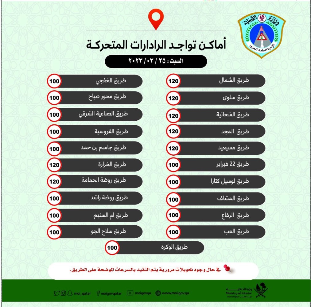 أعلنت الإدارة العامة للمرور عن أماكن تواجد الرادارات المتحركة اليوم السبت، والسرعات المسموح بها، منبهة إلى أنه في حال وجود تحويلات مرورية يتم التقيد بالسرعات الموضحة على الطريق.