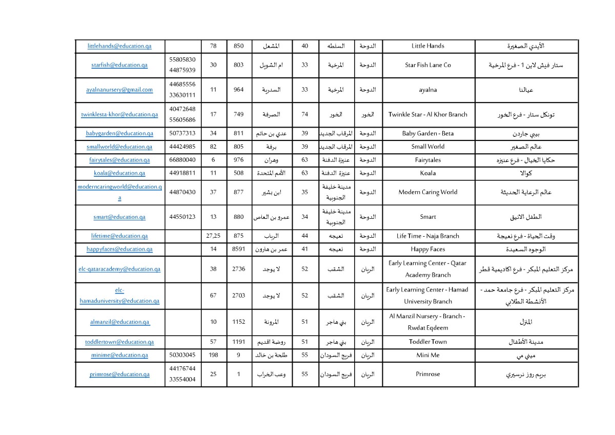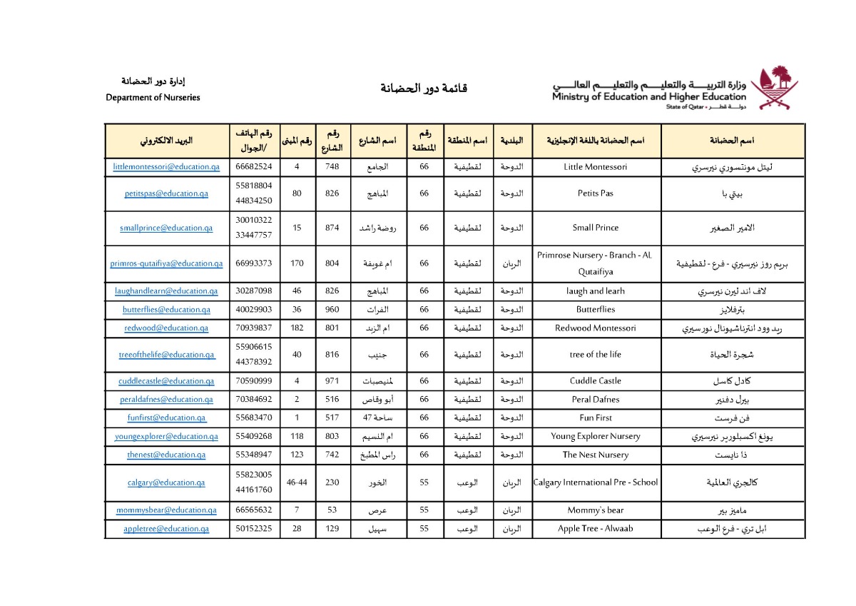 وتبلغ دور الحضانة في دولة قطر، 179 حضانة بما فيها دار حضانة مخصصة لاستقبال الأطفال من ذوي الاحتياجات الخاصة، ويمكن للزائرين التعرف على كل ما يتعلق بالمستندات المطلوبة والنماذج المتعلقة بتراخيص دور الحضانة.