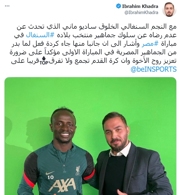وقال خضرة – على حسابه بموقع تويتر – إن ماني تحدث عن عدم رضاه عن سلوك جماهير منتخب بلاده السنغال في مباراة مصر .