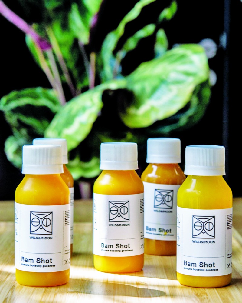 كما يقدم الوجبات الساخنة مثل الشوربات والسندويشات والبرغر. وبالنسبة للمشروبات الساخنة، يقدم القهوة والشاي وأنواع اللاتيه المختلفة مثل الماتشا. وصرح هيرف ساوكو "تم تحضير كافة منتجات Wild & The Moon منزليًا بمختلف المكونات البرية والعضوية والمحلية من مصادر نقية، باستخدام الخضراوات والفواكه والأعشاب والجذور والمكسرات والبذور، التي لا يوجد بها أي سكريات مكررة، ولا إضافات أو مواد كيميائية، ولا مكونات كائنات معدلة وراثيًا، ولا غلوتين، ولا منتجات ألبان، نحن نحب أن نقدمها بهذه الطريقة، نقية صحية. " كما أضاف "وصفاتنا مستوحاة من مكونات نؤمن بها ووجبات نحب ان نشاركها مع الأصدقاء والعائلة، لقد توارثنا النكهات من أسفارنا ودمجناها مع الأعشاب بطريقة مبتكرة لإنشاء طعم جديد يضفي الطاقة الحيوية ".