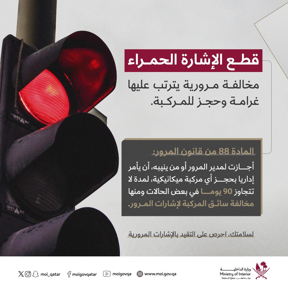 شددت وزارة الداخلية على خطورة قطع الإشارة الحمراء لما ينتج عنه من حوادث وإصابات، مؤكدة أهمية الحرص على التقيد بالإشارات المرورية، موضحة العقوبات المترتبة على ارتكاب مخالفة قطع الإشارة.