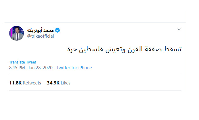 وكتب أبوتريكة عبر تويتر بعد إعلان ترامب عن خطته المزعومة للسلام: "تسقط صفقة القرن وتعيش فلسطين حرة".