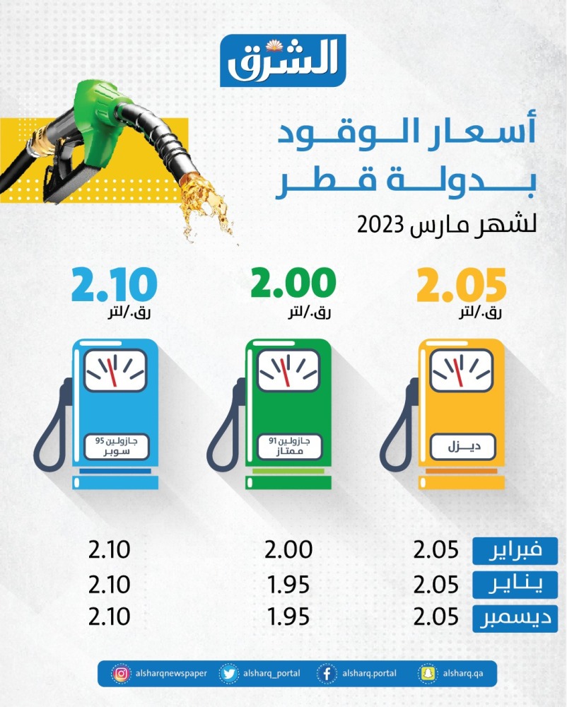 الديزل: 2.05 ريال، الجازولين سوبر 95: 2.10 ريال، الجازولين ممتاز 91: 1.95 ر.ق.