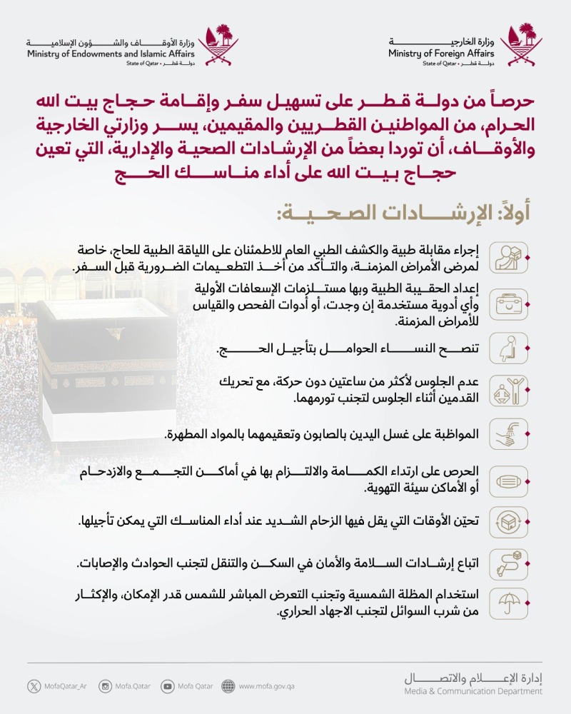 حرصاً من دولة قطر على تسهيل سفر وإقامة حجاج بيت الله الحرام، من المواطنين القطريين والمقيمين، نصحت وزارتا الخارجية والأوقاف، باتباع عدد من الإرشادات الصحية والإدارية، التي تُعين ضيوف الرحمن على أداء مناسك الحج.