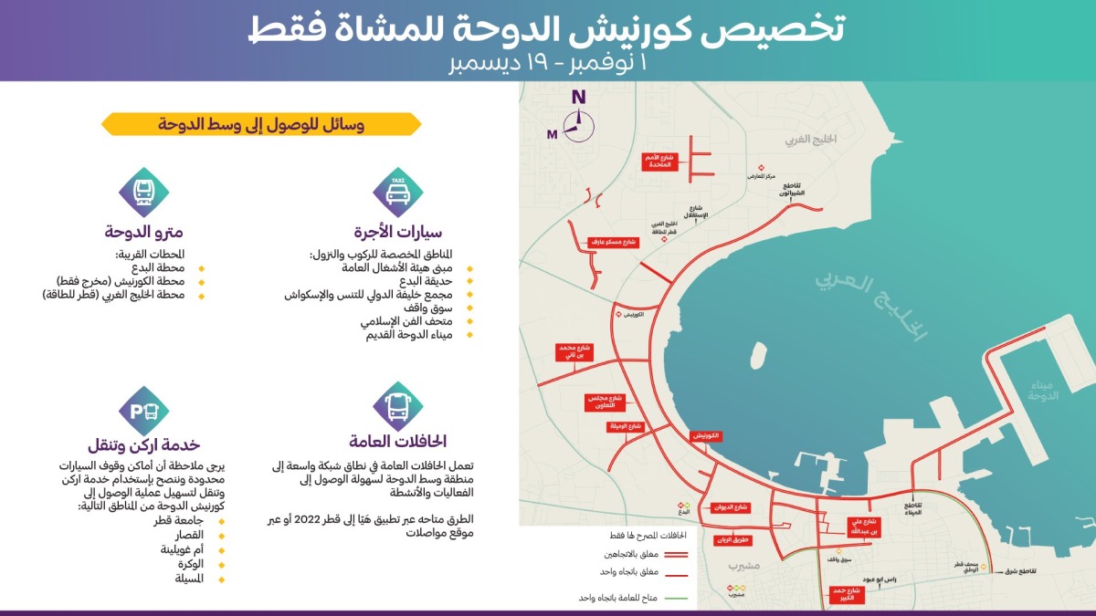 أعلنت اللجنة العليا للمشاريع والإرث أنه ابتداءً من يوم الثلاثاء الموافق 1 نوفمبر وحتى 19 ديسمبر، سيتم تخصيص كورنيش الدوحة للمشاة وذلك استعداداً لبطولة كأس العالم FIFA قطر 2022 المرتقبة.