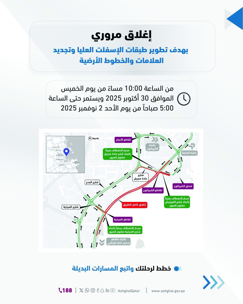 أعلنت هيئة الأشغال العامة «أشغال» عن إغلاق مؤقت كامل في شارع الكورنيش أمام القادمين من تقاطع المرخية باتجاه تقاطع الشيراتون، في كلا الاتجاهين، حيث يبدأ الإغلاق من الساعة 10:00 مساءً من يوم غد الخميس ويستمر حتى الساعة 5:00 صباحاً من يوم الأحد 2 نوفمبر 2025، وذلك بهدف تحسين طبقات الرصف وجودة القيادة وتجديد العلامات والخطوط الأرضية.