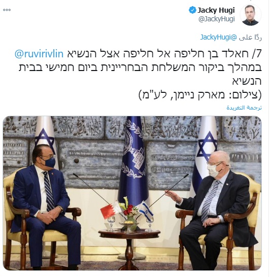 ونشر "حوجي" نص الحوار في سلسة تغريدات له على تويتر اختتمها بصورة التقطت يوم الخميس لخالد بن خليفة آل خليفة مع الرئيس الإسرائيلي رؤوفين ريفلين في منزل الأخير.