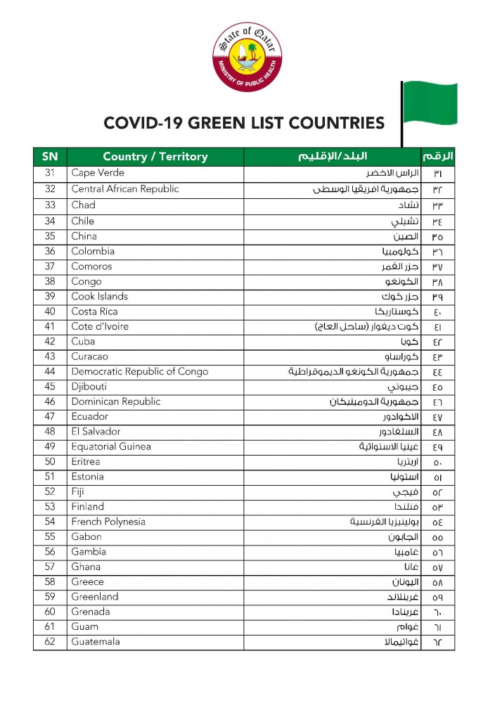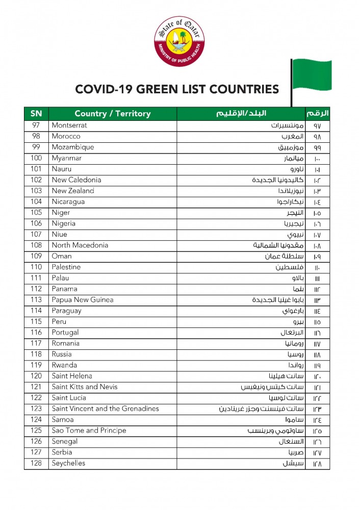 وضمت القائمة الخضراء 159 دولة بعد استبعاد 16 دولة بينها السعودية والإمارات، بينما ضمت القائمة الحمراء 47 دولة بعد أن كانت تضم 23 في التحديث السابق، وضمت القائمة الحمراء الاستثنائية 9 دول بينها مصر.