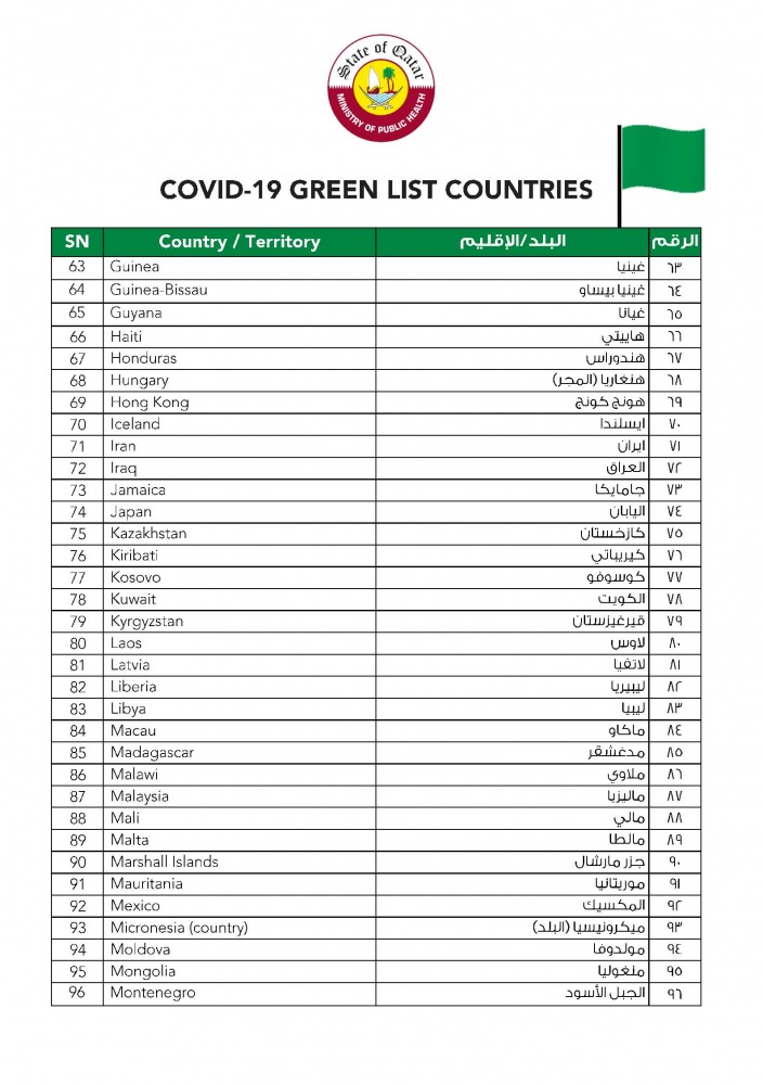 ومن بين دول القائمة الخضراء 14 دولة عربية هي: البحرين وجزر القمر وجيبوتي والعراق والكويت وليبيا وموريتانيا والمغرب وسلطنة عمان وفلسطين والصومال وسوريا وتونس واليمن.