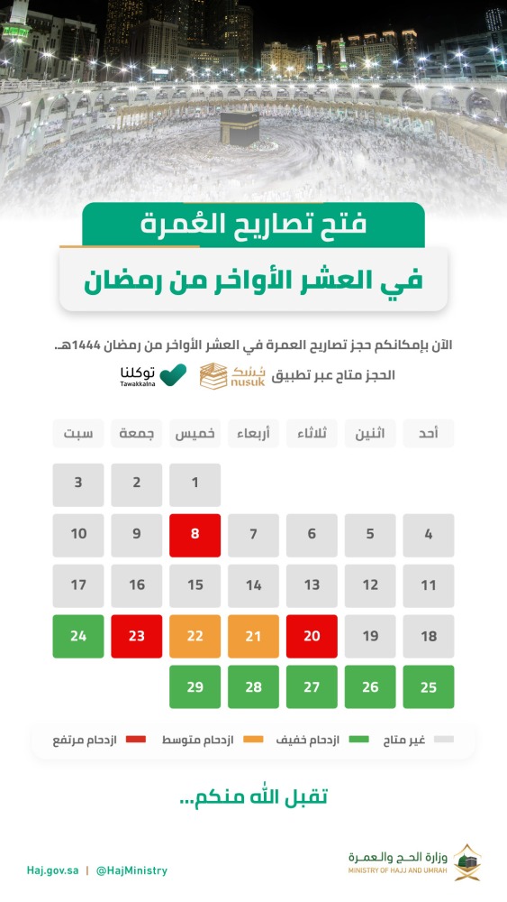 أعلنت وزارة الحج والعمرة في السعودية عن إتاحة تصاريح العمرة في العشر الأواخر من رمضان.