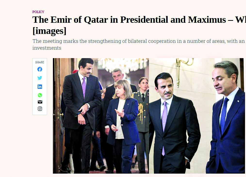 بيَّن تقرير لتلفزيون ANT1 اليوناني أن اجتماعات حضرة صاحب السمو الشيخ تميم بن حمد آل ثاني مع المسؤولين في اليونان تشكل بداية فصل جديد في العلاقات الثنائية بين البلدين وتعزز التعاون المشترك بين البلدين. وقال التقرير إن سياسة قطر الخارجية تعطي الأولوية لإيجاد حل للصراعات من خلال الحوار - مثل الصراع الحالي في الشرق الأوسط، مع احترام سيادة جميع البلدان. وبفضل خبرتها الطويلة والناجحة في التوسط في حل الأزمات الدولية وتطبيق التكتيك الدبلوماسي الاستباقي، أصبحت قطر مقبولة دوليا كوسيط نزيه في محادثات السلام. من جهتها، أبرزت صحيفة بروتاغون اليونانية أن جلسة المباحثات الرسمية بين حضرة صاحب السمو الشيخ تميم بن حمد آل ثاني ورئيس وزراء الجمهورية اليونانية أكدت الإرادة المتبادلة لتعزيز العلاقات القطرية اليونانية، واختتمت بالتوقيع على اتفاقيتين: اتفاقية التعاون العسكري ومذكرة التعاون لإجراء مشاورات سياسية في الأمور ذات الاهتمام المشترك. كما تمت مناقشة تعزيز التعاون في عدد من القطاعات، مع التركيز على الاقتصاد والاستثمارات والطاقة والثقافة.