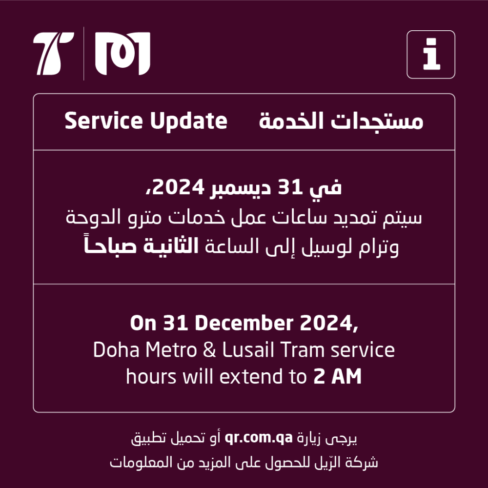 أعلن الحساب الرسمي لمترو الدوحة وترام لوسيل اليوم الإثنين عن تمديد ساعات العمل والخدمات لنقل الركاب، وذلك إلى الساعة 2 صباحاً في 31 ديسمبر الجاري.