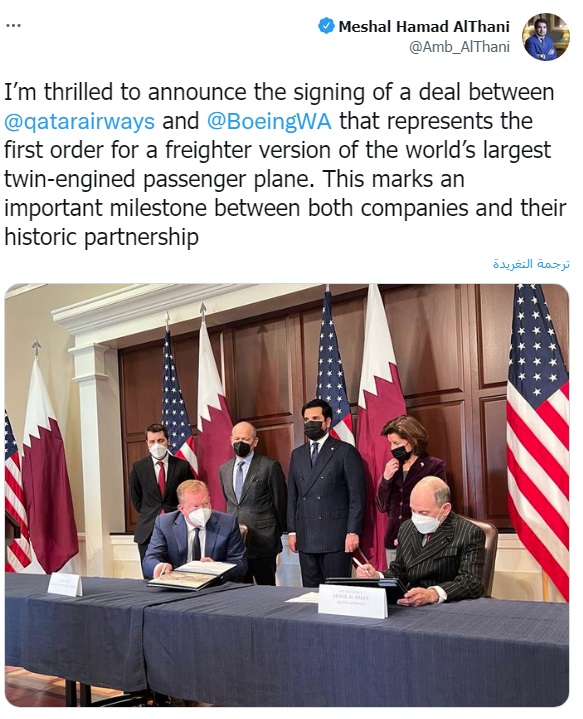 وأضاف سعادته – على حسابه الرسمي بموقع تويتر – تمثل هذه الصفقة الطلب الأول من نسخة الشحن لطائرات الركاب ذات المحركين في العالم.