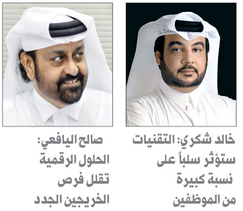 وعن الحلول المطروحة للظاهرة قال الكواري إنه يجب إعادة تأهيل القوى العاملة: ويجب التركيز على تدريب العاملين على مهارات جديدة تتماشى مع سوق العمل الحديث وتعزيز ريادة الأعمال: التكنولوجيا لا تلغي الوظائف فقط، بل تخلق فرصًا جديدة للشركات الناشئة والمشاريع الرقمية.