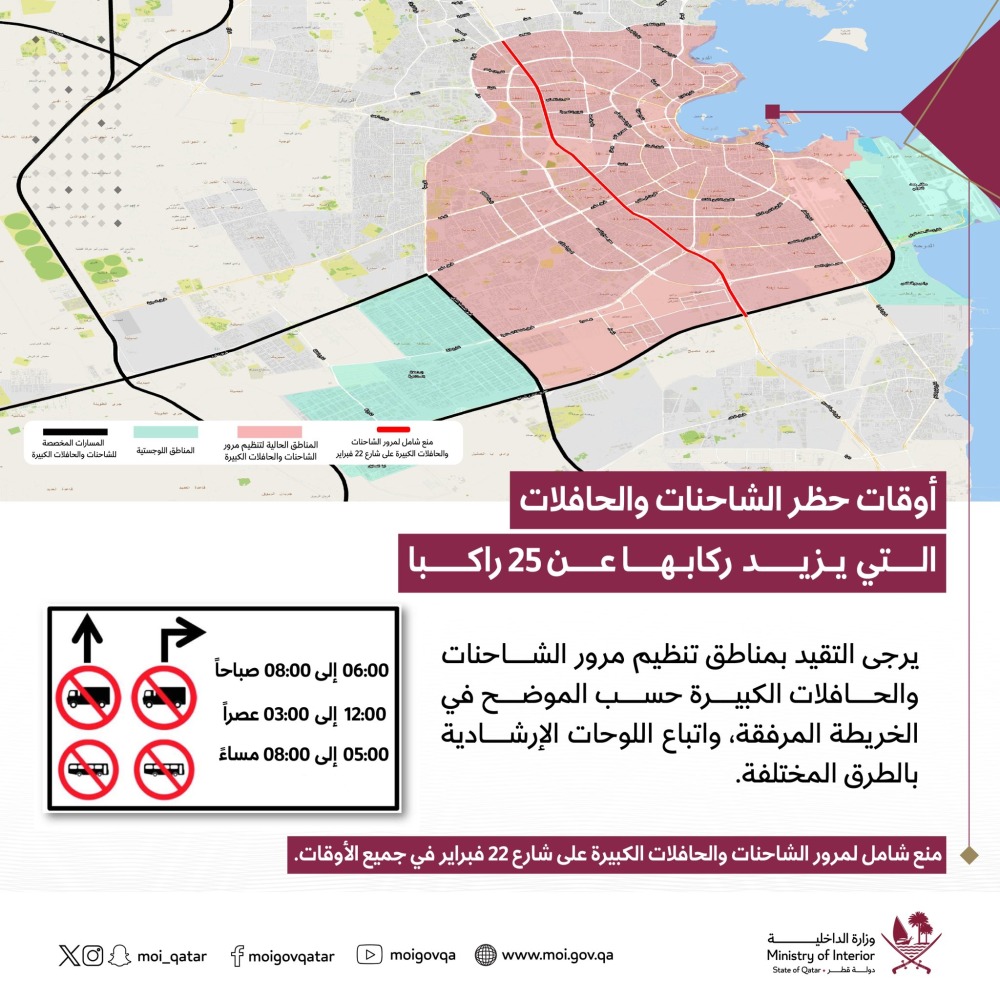 تعلن الإدارة العامة للمرور بالتنسيق مع الجهات ذات الصلة عن تنظيم حركة مرور الشاحنات والحافلات التي يزيد عدد ركابها عن 25 راكبا داخل مدينة الدوحة، وحظر دخولها إلا بتصريح (منع شامل لمرور الشاحنات والحافلات الكبيرة على شارع 22 فبراير في جميع الأوقات) #الداخلية_قطر #مرور_قطر pic.twitter.com/eRkbhVNBlq