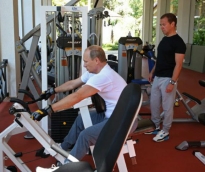 يواصل الرئيس الروسي فلاديمير بوتين مسلسل استعراض قدراته الجسدية، وإظهار صورته ليس بوصفه رئيساً لواحدة من أقوى دول العالم فحسب، بل كشخص قوي مفتول العضلات أيضاً. فقد نشر الكرملين صوراً لبوتين وهو يؤدي تمارين رياضية في صالة للألعاب الرياضية برفقة رئيس الوزراء ديمتري ميدفيديف في في لوتشاروف روتشي، مقر إقامة بوتين على البحر الأسود، بالقرب من منتجع سوتشي. وأظهرت بعض الصور بوتين وميدفيديف يمارسان التمارين على الأجهزة الرياضية المختلفة، ومن بينها جهاز لبناء العضلات، وكأنهما يتنافسان. كما نشر صوراً لهما وهما يتناولان طعام الإفطار، ويعدان المشاوي، ويشربان الشاي بعد أداء التمارين الرياضية. وتذكر هذه الصور بلقطات سابقة لبوتين وهو على ظهر حصان ويقود طائرة أسرع من الصوت ويصطاد نمراً، أو يمارس رياضة الجودو.